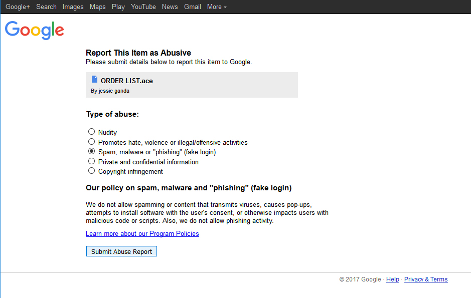 UPDATE 2017-09-01: another three days have passed since the last update, and Google has still failed to take any evidence steps to address the issue (the malicious files are still available for download, and the GMail accounts that sent them still appear to be active) - bringing us to a total of 21 days since we first reported the issue to Google. Starting on August 30th, which was the 20 day point, we began reporting the malicious Google Docs link daily, using the "Report abuse" link on the same page - and so far, it appears that Google is ignoring those reports as well.