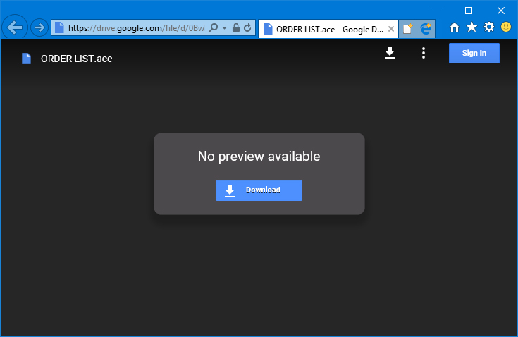 Recently, we've started seeing a new type of spam-driven EMail scam involving fake purchase orders. We've seen two or three different examples of the scam, but they all share some common traits: they come from GMail accounts (and one example use an Outlook.com address as the reply-to), the malicious files are hidden inside less-common archive formats such as .ACE and .REV (presumably to avoid detection by virus scanners), the spamming operation seems to be a bit more interactive in that they don't send the malware attachments/links unless you reply (presumably to avoid revealing their malware unless they think they have a "live one" on the hook), and they all use Google drive to host the files - in addition to sending them by EMail.