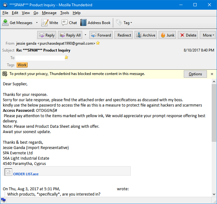 The first example of this spam that we received this summer arrived on August 8th: it came from someone claiming to be "jessie ganda" & using the EMail address purchasedepat1990@gmail.com - out of curiousity for how the scam worked, I decided to play along and reply. Two days later, on August 10th, the scammer replied by sending me a Google drive link to the supposed purchase order document - which was actually a .ACE archive containing a .EXE file (in other words, obvious malware).