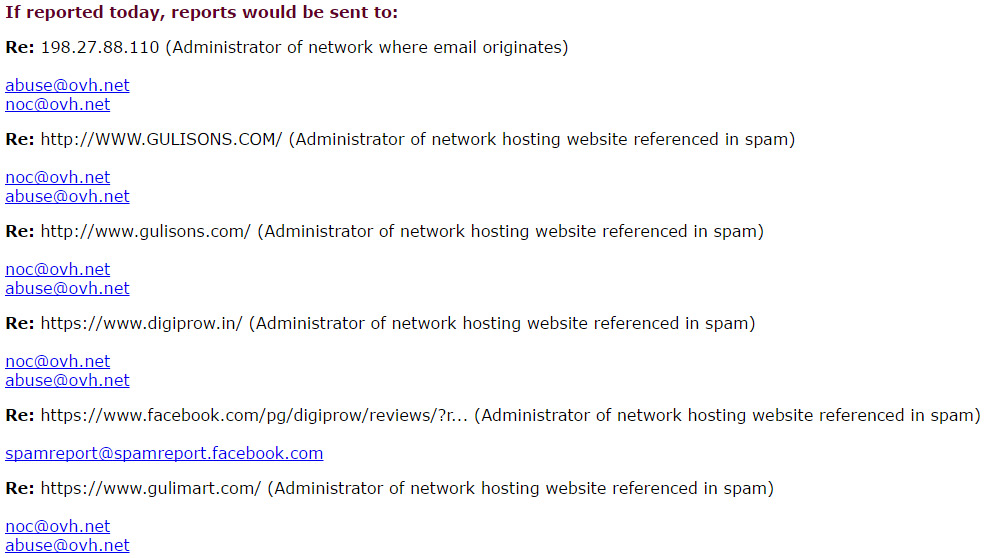 In that context, it seems odd for GuliSons.com to send out spam that not only comes from their company domain name, but also includes a link to their website - which is hosted by the same provider as their EMail (OVH), meaning that a single spam complaint could conceivably result in the suspension/termination of both their official website & EMail. Putting so many eggs in one basket seems like a fairly big risk, unless GuliSons.com/DigiProw.in have some reason to believe that, even if they are reported, OVH won't take any action against their account...