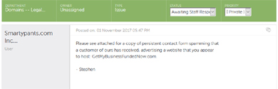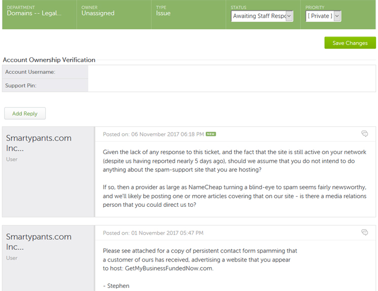 We took the standard steps to determine where the spam support site was hosted: first looking up the IP address of the server hosting it, 192.64.119.159 - and then looking up that IP address in a geolocation service that also also lists the owner of the IP address: in this case, the owner is listed as "Namecheap Inc." Being familiar with NameCheap & knowing them as a fairly large, reputable (by and large) provider, we decided to report the issue to them & looked up the contact information for their abuse department. We then sent copy of the full spam message to their primary abuse reporting address, abuse@namecheap.com, including the offending links to the spam support site hosted on their servers. That was on November 1st... after 5 days with no response whatsoever, we sent a follow-up through their support ticket system. That was 4 days ago, on November 6th - and the response since then? The best way to illustrate that is with a screenshot of the replies/history for that support ticket: