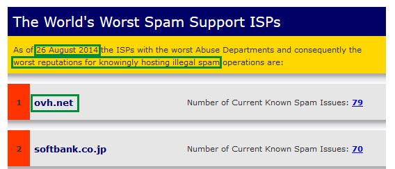 When you run a mail server and spend several hours a day blocking & reporting spam, patterns become noticeable after a while - in particular, which providers are good at addressing spam complaints. You also start to notice which providers are not so good at addressing spam complaints, which is how I first became aware of OVH Hosting. Before 2015, I was largely unaware of OVH - they are (or at least claim to be) the 3rd largest hosting provider in the world, but they are based in France and until recently they had operated primarily in that market, so I hadn't had much contact with them. They are well known in a few circles, however - in September of 2016, they were on the receiving end of a record-breaking distributed denial of service (DDoS) attack. They are also known for an even more dubious honour: in August of 2014, they were listed by SpamHaus as #1 on their list of "The World's Worst Spam Support ISPs".
