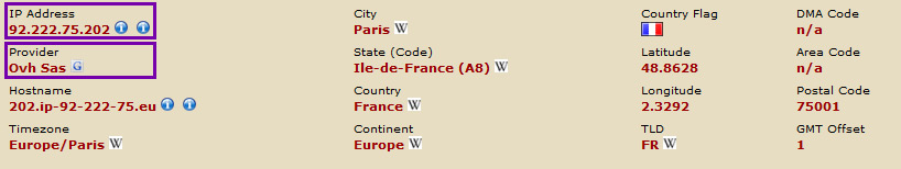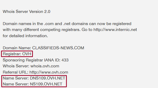 The owners of the site don't even bother to use CloudFlare or the like to hide where they're hosted, as the domain name is using the nameservers ns109.ovh.net and dns109.ovh.net - and OVH is also the registrar (registration provider) for the domain name, something it shares in common with the domains used for the redirect URLs.