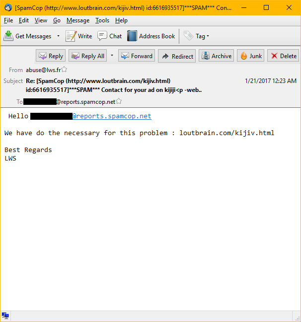 Even with OVH's "treat the symptoms, ignore the cause" approach, it has often taken them a week - or more - to take any action. In the fall of 2016, when the Kijii-spoofing spam restarted after a 2-3 month lull, we finally lost patience and decided to post about it on their forums; and as something of an experiment, we decided to keep track of how long the spam-vertised links remained active after they had been reported to OVH. We received another of the Kijiji-spoofing spam EMails from OVH's servers on January 14th of this year and posted the details on OVH's forums (as well as reporting it to them through Spamcop & their abuse-reporting address) - and it was not until January 19th (5 days later) that the spam redirect links were shut down. In contrast, shortly after the Kijiji-spoofing spam started up again, one of those EMails contained a link to a redirect URL hosted by a different provider - within 3 hours of reporting the link to them, we received a response from them stating that the offending site had been shut down (which we verified). A significantly faster turnaround than the roughly 120 hours that it took OVH to do the same thing, with a handful of forum replies being the only response we've received from them despite having reported dozens of near-identical spam from their servers over the course of nearly two years.