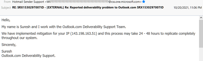 When first notified of the issue, we submitted a "delisting" request to Microsoft; after being subjected to their usual run-around (where they appear to reject all delisting requests out-of-hand, and only actually investigate/act on them if you hound them about it), we were told that Microsoft had "implemented mitigation" for our IP (AKA removed our server from their blacklist) and the issue would be resolved within 24-48 hours... and that was on October 20th.