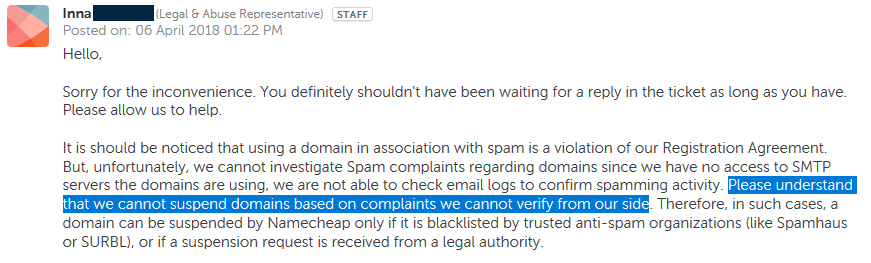 Back in November of 2017, we wrote about the provider NameCheap.com - and the difficultly we had encountered in getting them to do anything about a website that they hosted, which we had repeatedly been spammed with links for. The focus of that article was merely on their lack of any response to the abuse reports we had sent to them, after (at the time) more an week. But when we finally DID receive a reply, their response was more ridiculous than we could have possibly expected.
