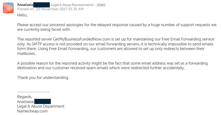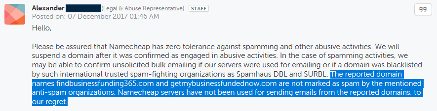 It also turned that this was not an isolated issue - or a new one either. A recent article published by Brian Krebs, one of the comments linked to blog post from 2015, which details almost the exact same issue: same spammer tactic (using domains hosted by/registered with Namecheap to embed content from separate stes via frames/masked redirects), and the exact same run-around from Namecheap's support staff (repeatedly claiming that the spam sites weren't hosted by them, when they clearly were) - the only difference seems to be that those spammers were hawking weight lose products instead of business loans. So that issue has been ongoing for at least 3 years now, and Namecheap is well-aware of it. While the KrebsOnSecurity article wasn't about that particular issue, it did mention NameCheap as one of the top registrars for TLDs (domain name extensions) that are favoured by spammers and spammers; the article also includes a quote from Namecheap's CEO, Richard Kirkendall, where (among other things) he accuses Krebs - a noted tech security ressearcher/journalist - of making "irresponsible assumptions." Kirkendall (or at least someone claiming to be him) then jumped into the article's comments, and didn't exactly inspire confidence in the company's willingness to address spam issues - particularly when he referred to people who oppose spamming as "nazis."